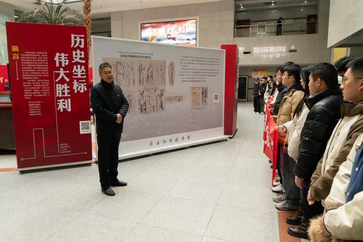 在济南战役史实展现场,学院党委书记夏卫东为全体师生党员讲授专题党课。他强调,铭记党史、缅怀先烈是党员的必修课,大家要深刻领悟红色历史中蕴含的精神力量,在思想上持续淬炼提升,在行动上主动担当作为,以实干实绩响应时代号召。随后,在讲解员的带领下,依次参观了“伟大胜利 历史坐标”“运筹帷幄 剑指济南”“八天八夜 鏖战古城”“攻坚之战 决胜密码”等八大主题展区,展板上的史料图片,生动再现了济南战役的战略部署、隐蔽战线、人民支前等情景,全体师生党员驻足在烈士名录与资料图片前,深切缅怀革命先辈的英雄事迹。