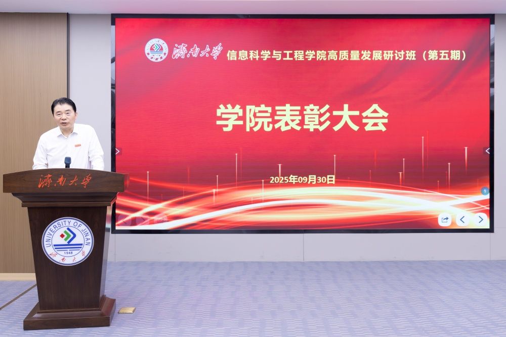 金秋时节,硕果盈枝。为系统总结学院近两年的发展成就,凝聚共识,表彰先进,共同谋划学院高质量发展的新蓝图,9月30日下午,信息科学与工程学院高质量发展研讨班(第五期)暨学院表彰大会在第五学术报告厅举行。学校党委常委、纪委书记、省监委驻济南大学监察专员续铁,党委学生工作处、人力资源处、教务处、科技处、研究生院、校团委等部门负责人及学院领导班子出席会议,学院获奖教师及教师代表参加会议。会议由学院党委书记夏卫东主持。