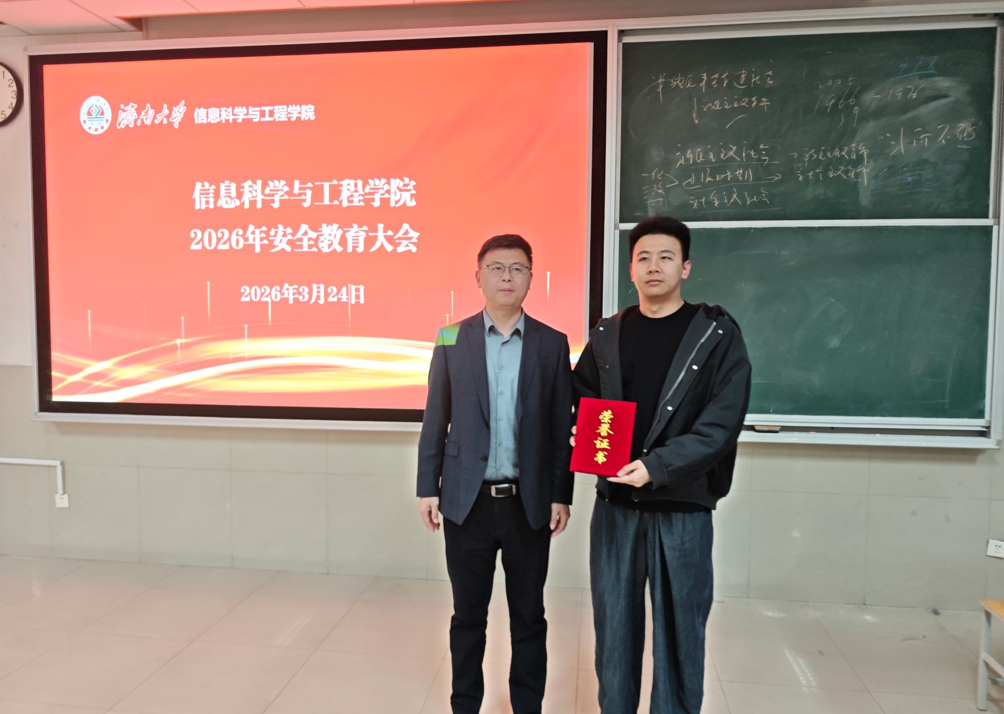 为切实保障学生实验操作安全,压实安全管理责任,营造安全、有序、文明的学习科研环境,3月24日下午,信息科学与工程学院召开2026年学生安全教育大会。学院党委副书记、副院长郝伟、实验室中心主任孙传伟、研究生辅导员及全体研究生参会,会议围绕实验室安全、科研安全、宿舍安全等核心内容展开,全面强化学生安全防范意识与责任意识。